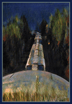 I was crossing a bridge over the CPR railway when I noticed a freight train approaching the bridge. The light, also minimal, seemed suitable for a picture if I could get up. No cars were coming, so I leapt out of the car, camera in hand, and took this picture of the top of the box cars speeding through the night and around a bend in the rail line. It felt right that I develop the image in an impressionistic style.